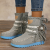 The Boho Western Boots are a stylish and comfortable addition to your footwear collection. Crafted from soft suede, these ankle boots feature playful fringe accents and a sturdy rubber sole, making them perfect for everyday wear. Whether you're heading to work, running errands, or enjoying a casual day out, these boots offer both fashion and function.