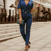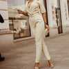 The jumpsuit is a refined piece that seamlessly blends sophistication and comfort. Featuring a tailored silhouette with a notched lapel collar and a deep V-neckline, this jumpsuit is designed to flatter and impress. The included belt cinches the waist, enhancing your figure, while the half sleeves and sturdy polyester fabric provide a polished and stylish appearance.
