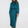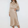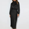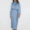 The dress is a timeless piece that exudes sophistication and charm. Crafted from satin, this floor-length gown features a flattering A-line silhouette and subtle pleats, making it perfect for formal dinners, weddings, or elegant evening events.