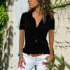 Elevate your wardrobe with this stylish blouse that seamlessly blends elegance and comfort. Featuring a classic collar, short sleeves, and practical front pockets, it's the perfect choice for both work and casual outfits.