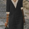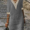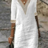 This linen-blend dress combines comfort and elegance, making it a versatile addition to your wardrobe. The V-neckline adorned with delicate lace trim adds a touch of femininity, while the relaxed fit and 3/4 sleeves ensure ease of movement and breathability.